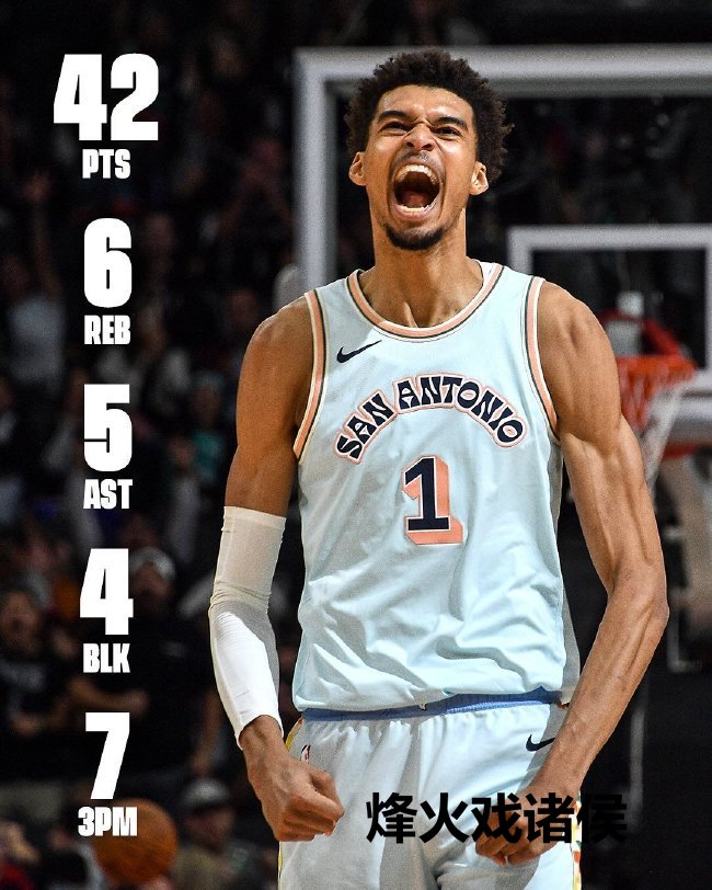 文班亚马加时赛砍下8分,保罗要害三分杀死比赛,马刺通过加时赢下比赛。文班24投13中、三分15投7中,罚球12中9,砍下42分6篮板5助攻2抢断4盖帽。
