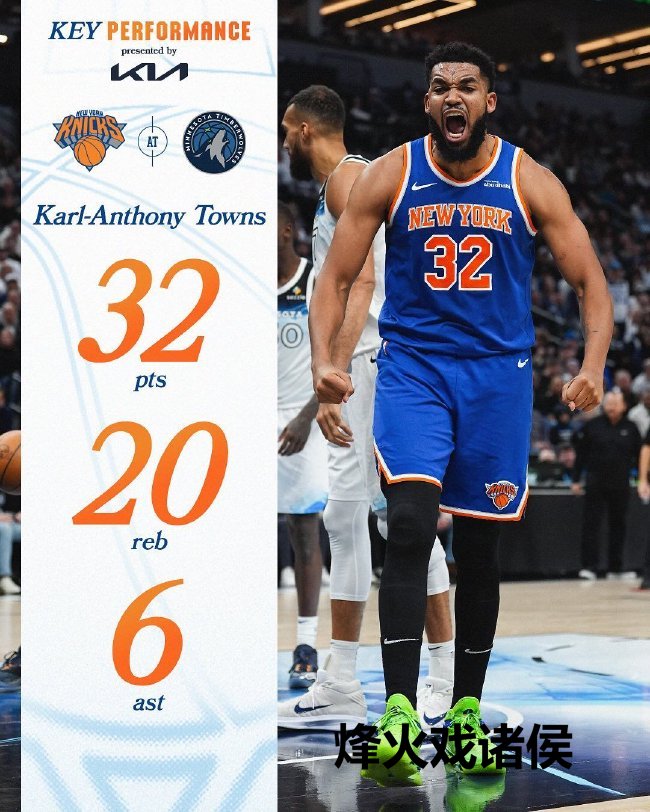 唐斯初度以客队球员的身份来到标靶中心对阵老东家丛林狼,全场他14投12中狂轰32分20篮板6助攻2抢断率队获取大捷。尼克斯2连胜,17胜10负排在东部第三。